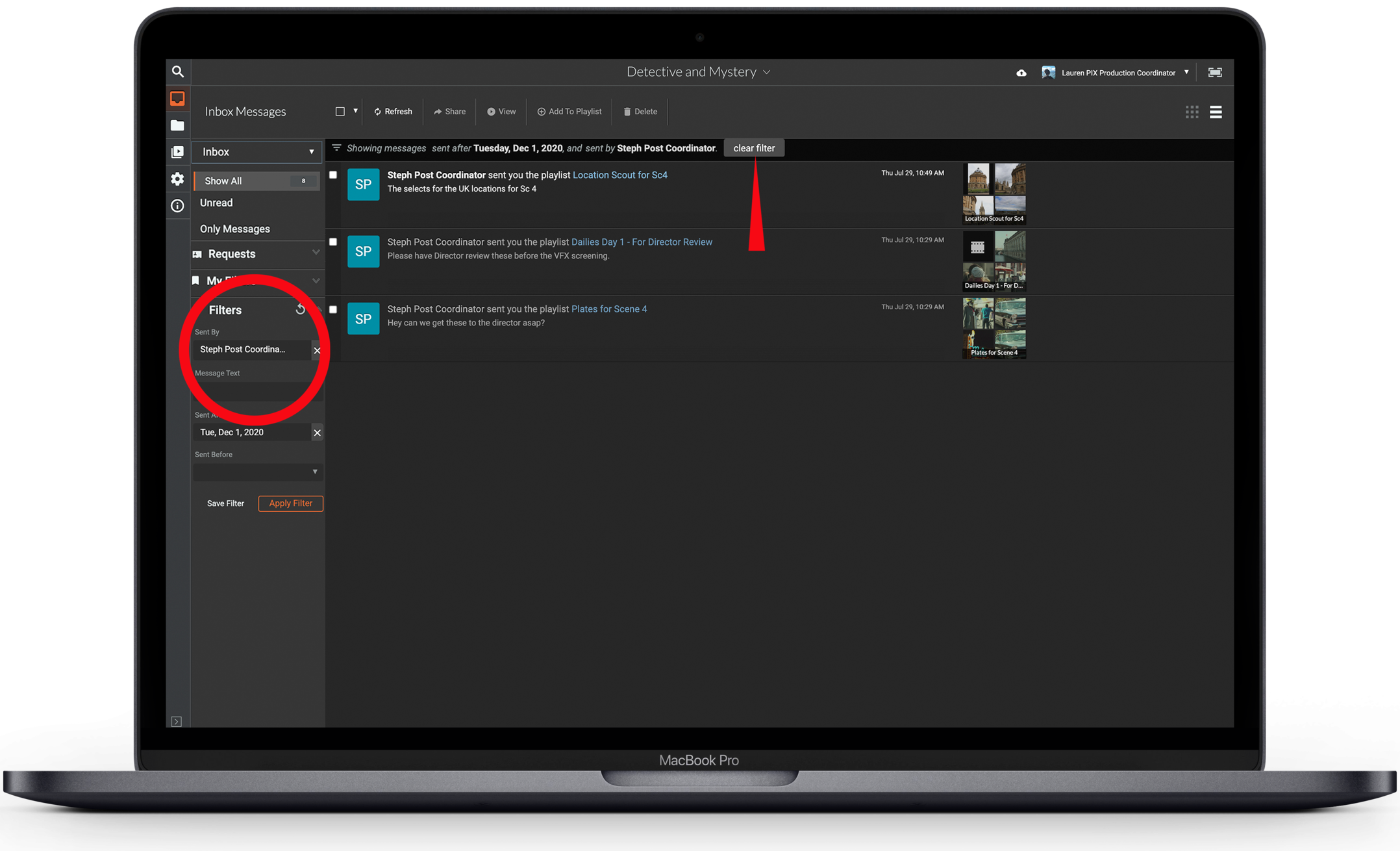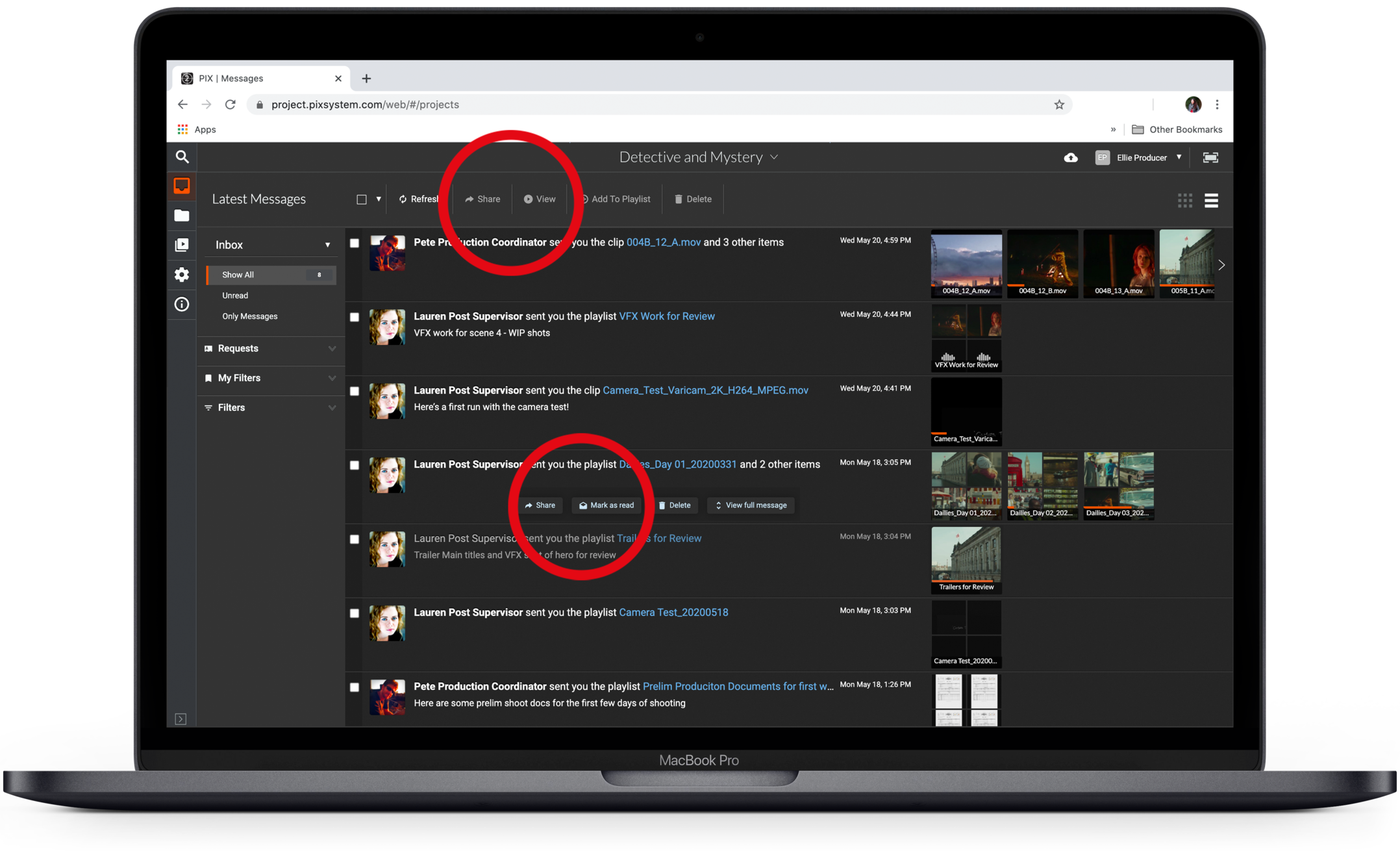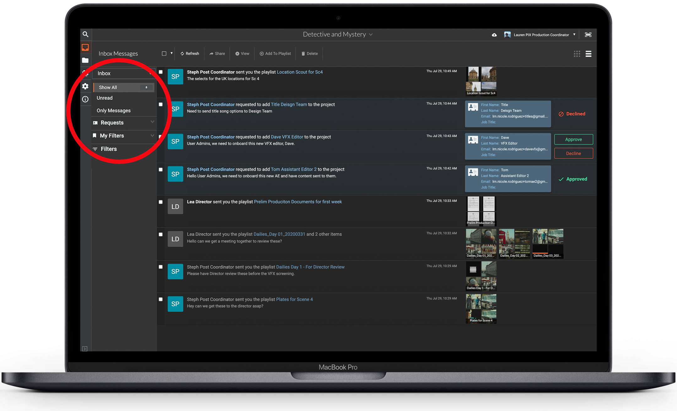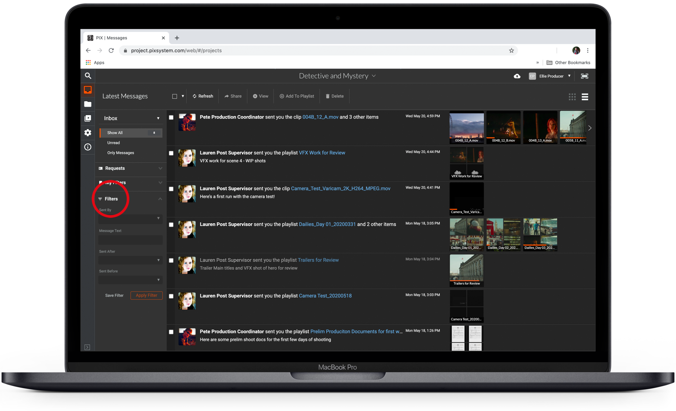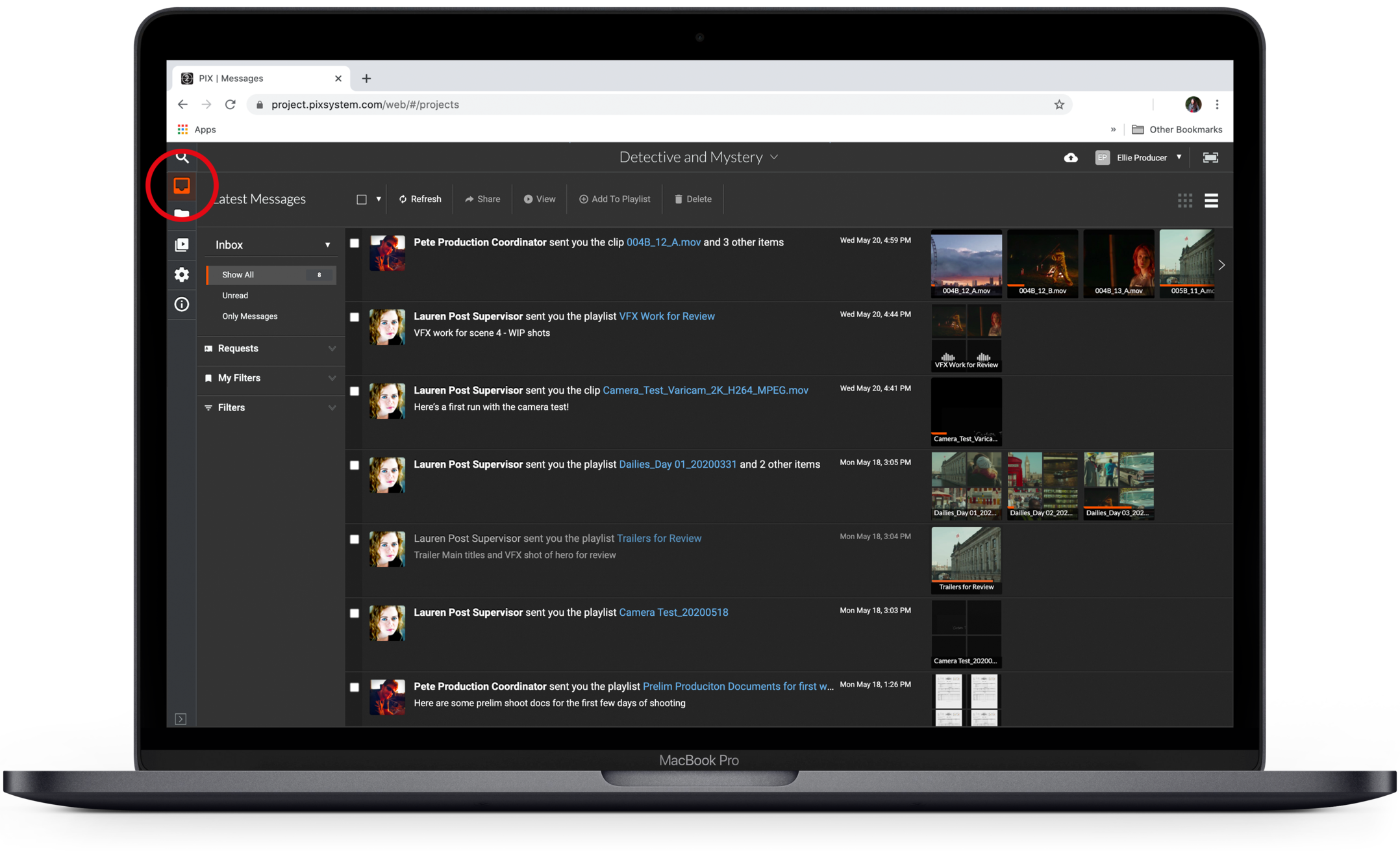 The PIX Inbox functions in the same way an email inbox would. It will house all content that has been specifically sent to that user. Users will be able to view content directly from their inbox and, if their permissions permit it, send that content on to other users on that same project.