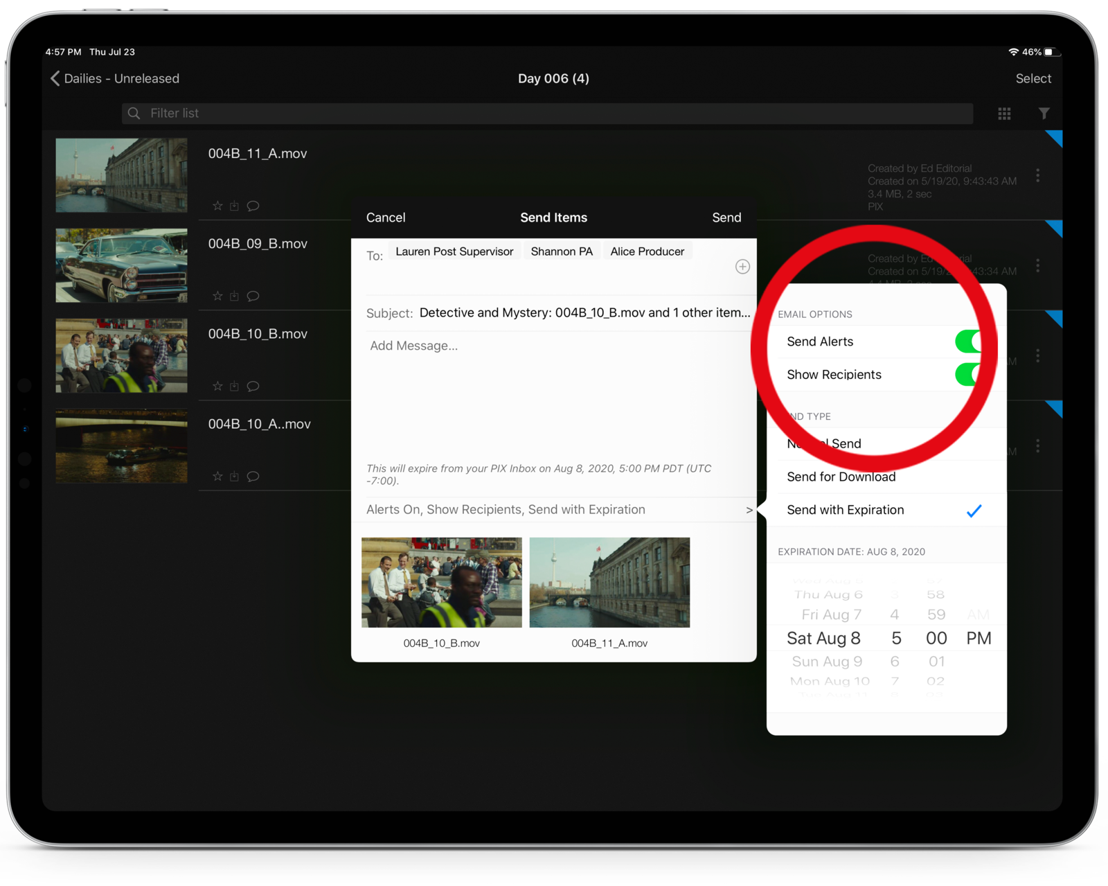 - Send with Expiration: Gives the sender the ability to set an expiration date/time for the content to be removed from the recipient's inbox. See the Share Media with an Expiration page for more information.