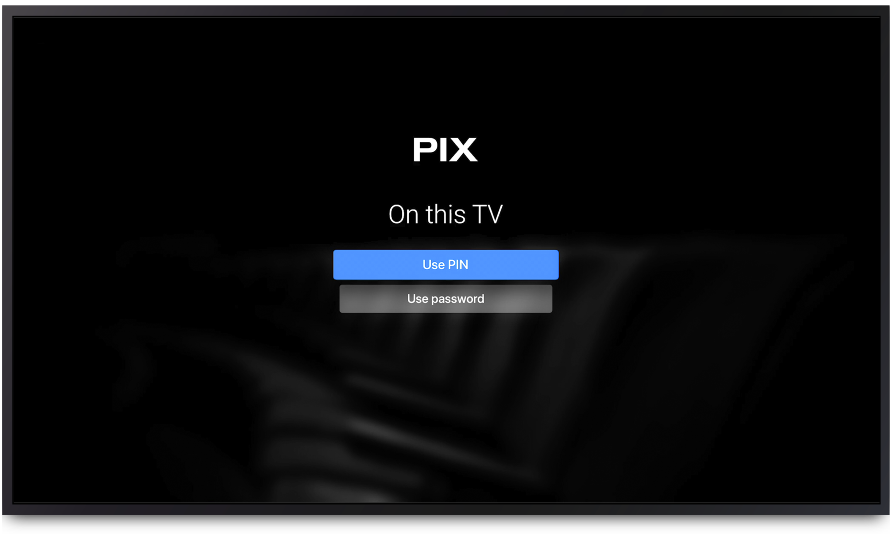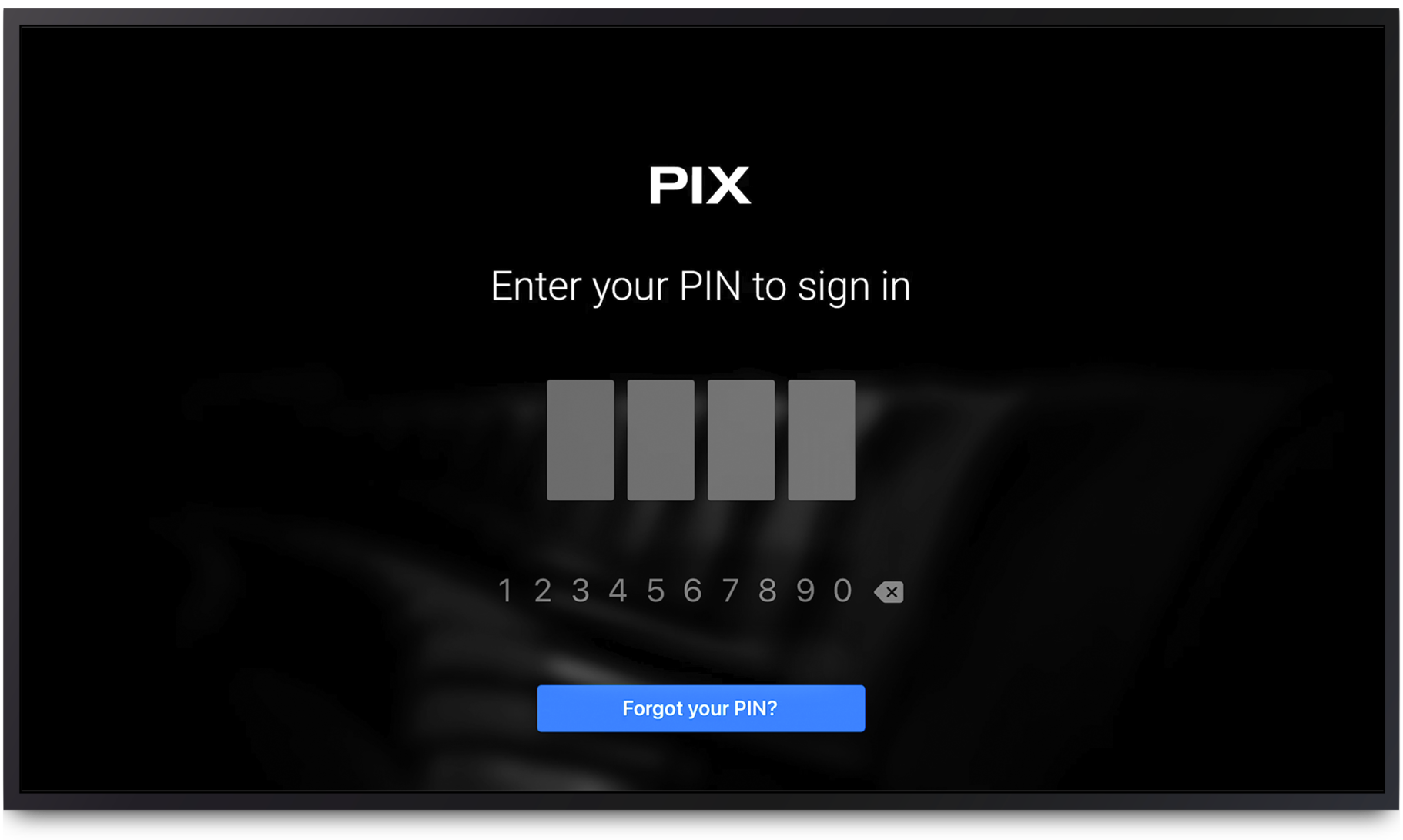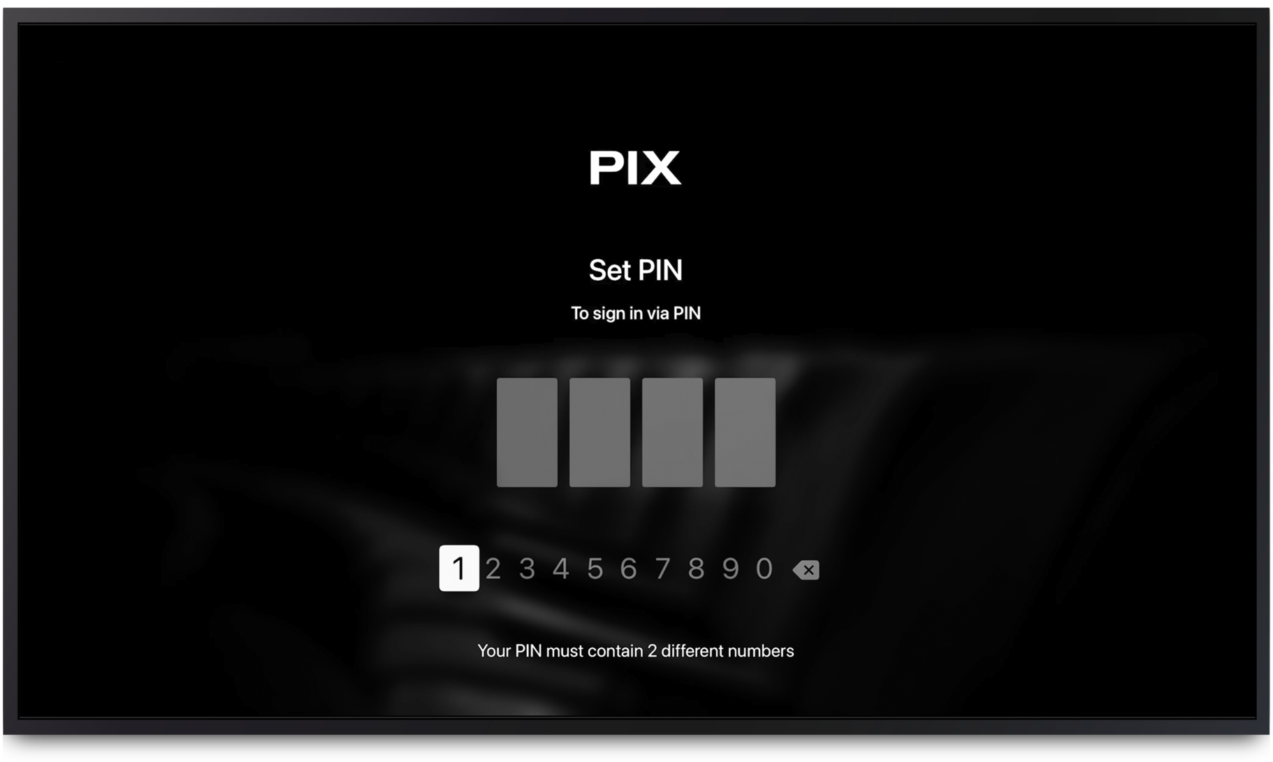 You can choose to use a PIN to log in to your PIX for Apple TV. Choosing this option will save your user account to the Apple TV device, and for future logins, you will be able to use a PIN of your choosing.