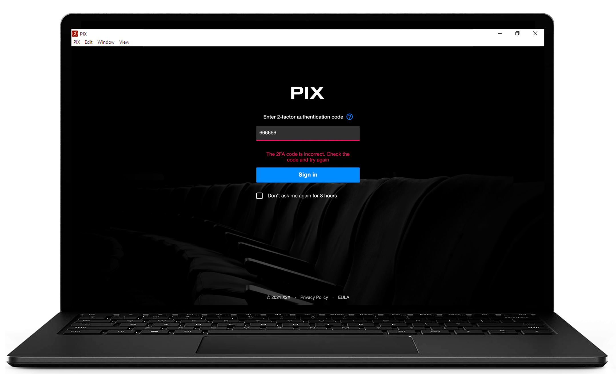 Enter the code displayed in the app in the 2-Factor Authentication Code field on the PIX Sign In page.