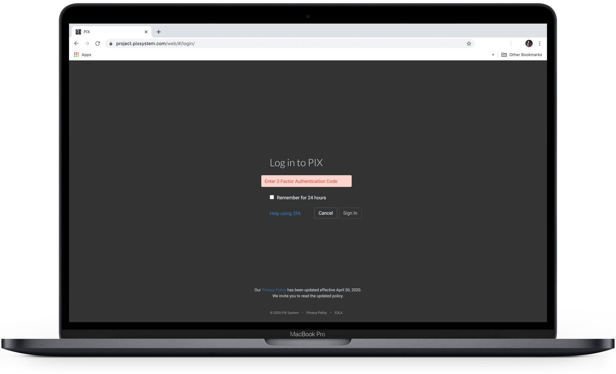 If you cannot locate your code, or if the code you have is not working, please reach out to PIX Support as we may need to clear your 2FA so that you can set it up again for your account.