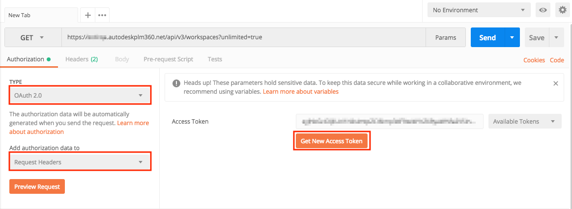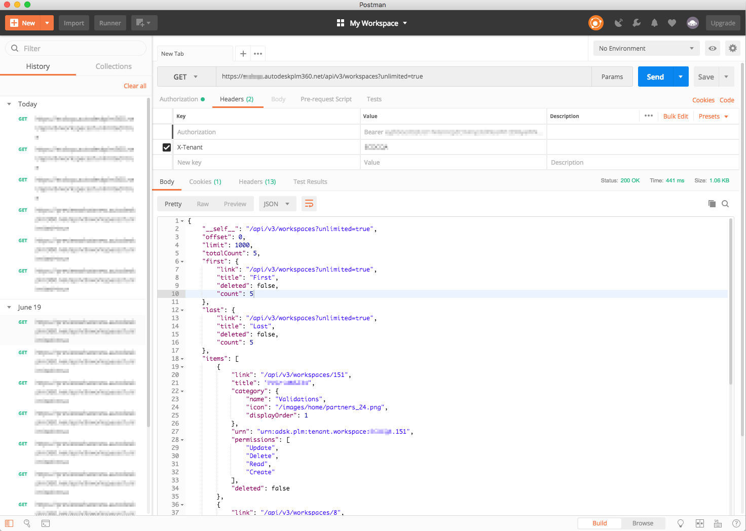 curl -X GET -H "Authorization: Bearer [your access token]" -H "x-tenant: [your tenant name]" -H "Accept: application/json" -H "Content-Type: application/json" " https://[tenant name].autodeskplm360.net/api/v3/workspaces?unlimited=true