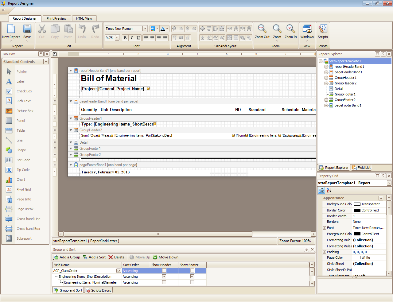 Shows the structure of a report in a tree form, providing easy access to report elements. Select an element to change its settings using the Property Grid.