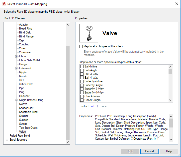 Share Email Facebook Twitter LinkedIn Select Plant 3D Class Mapping Dialog Box Maps P&ID component type and properties to Plant 3D. Map to All Subtypes of this Class If selected, mapping applies to child classes. Parent topic: P&ID Object Mapping