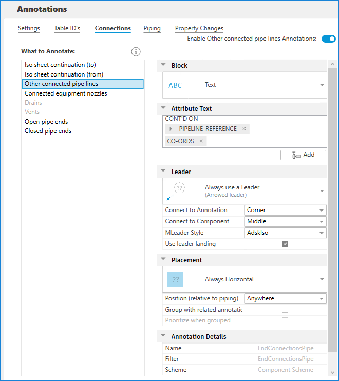 - Provide block, leader style, and leader placement settings for all annotations (Table ID, End connection, Piping, Property Changes). You can customize the default settings for newly created annotations.