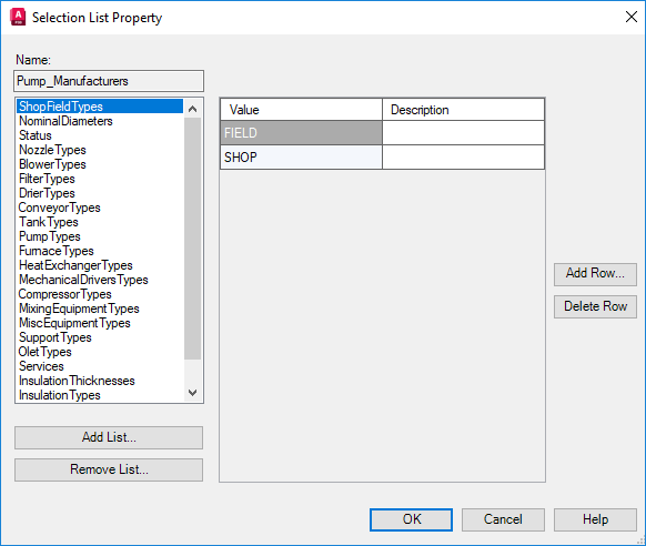Use selection lists to enforce standard sizes for items such as pipe specs, pipe sizes, and instrument types, or when you want designers to choose from a predefined set of options.