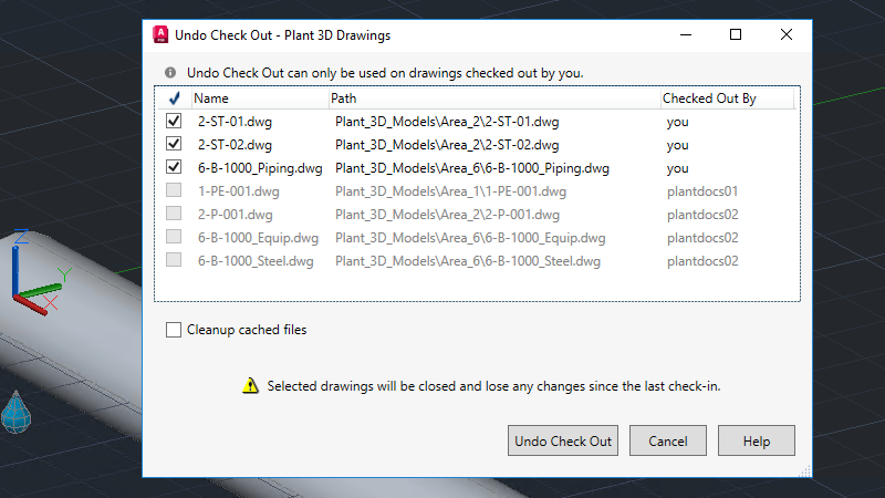 Note: You cannot select drawings that are checked out by other users. You need to force undo the check-out of a drawing individually.