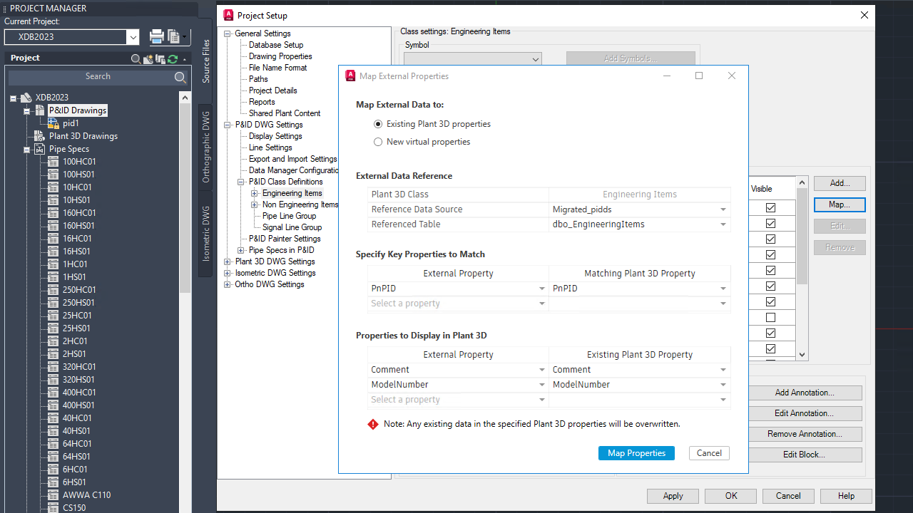 The previous AutoCAD Plant 3D release supported mapping of external data to a virtual property. In this release, you can also map object data from external sources to existing Plant 3D properties.