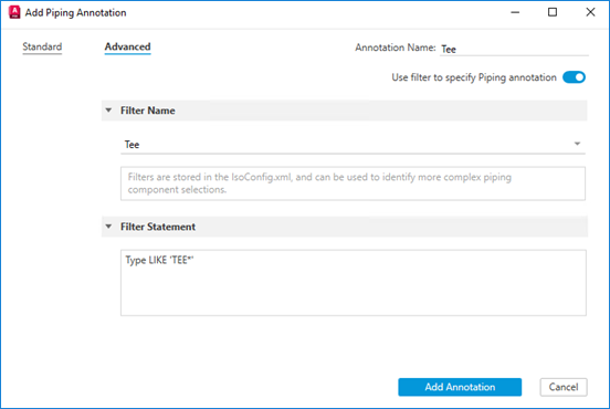 Allows selection of any existing filters to add to new piping annotations. Filters are stored in the IsoConfig.xml and can be used to identify more complex piping components selections.