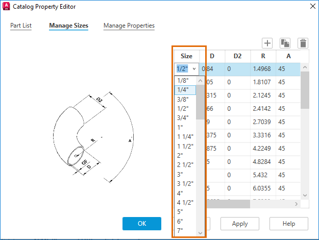 In the Catalog Property Editor dialog box (Manage Sizes tab), you can perform the following: