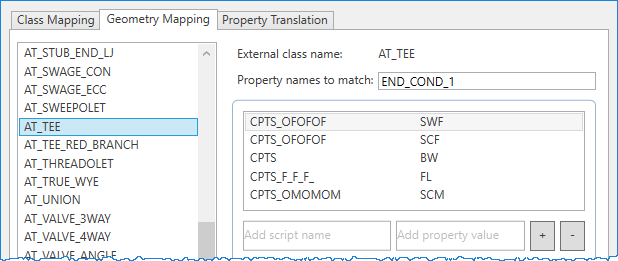 Each script has associated properties that indicate how the endtypes are to be drawn. AutoPLANT or CADWorx properties are matched to AutoCAD Plant 3D toolset versions. In many cases, you may want a class to have different shapes, depending on context. For example, you may want AT_TEE (AutoPLANT) or Tee (CADWorx) to have a welded tee, a socked-welded tee, or a flanged tee in different locations. You can specify a property name or names to match as criteria for the graphical shape to be used.