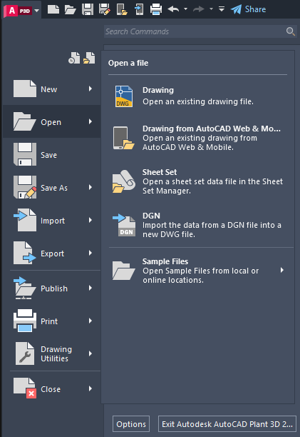The Application menu, located in the top-left corner of the program, replaces the traditional menu structure you might be familiar with in previous releases of AutoCAD Plant 3D toolset.