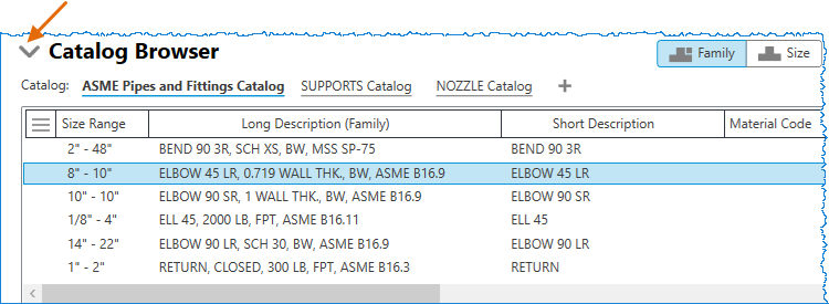 You can click on the expander to expand or collapse the Catalog Browser. Collapsing the Catalog Browser provides more visibility of the Spec and Catalog tabs for editing components.