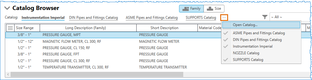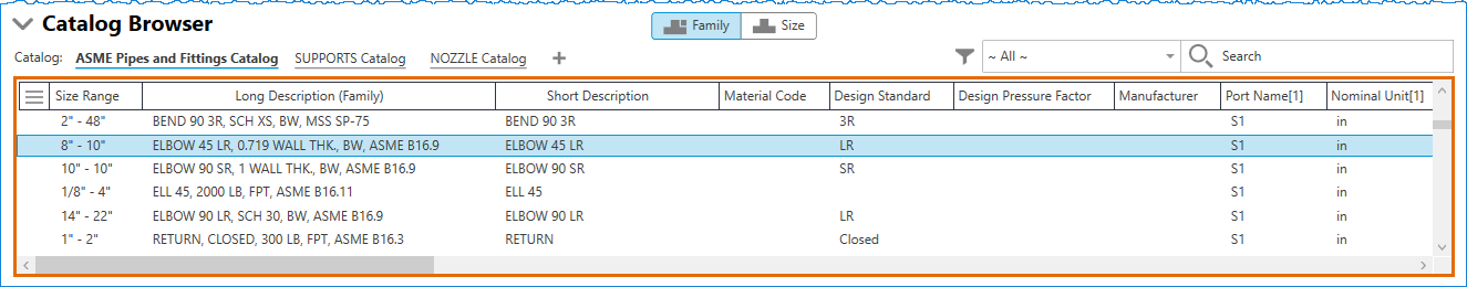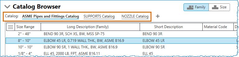The Catalog Browser is located at the bottom panel of the Spec and Catalog tabs. It displays everything from a catalog with customization and filtering functionality.