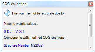 If live COG is enabled and you select a Plant object that does not have weight, a validation window displays to identify the components that are missing weight. Live COG validation is not enabled if no selected component has weight.