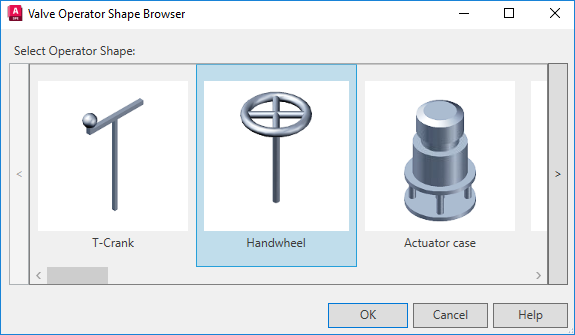 Share Email Facebook Twitter LinkedIn Valve Operator Shape Browser Dialog Box Specifies a valve operator. Select Operator Shape Specifies a parametric shape for the operator. Parent topic: Spec Tab Related Concepts About Assigning Default Valve OperatorsAbout Assigning Default Valve Operators