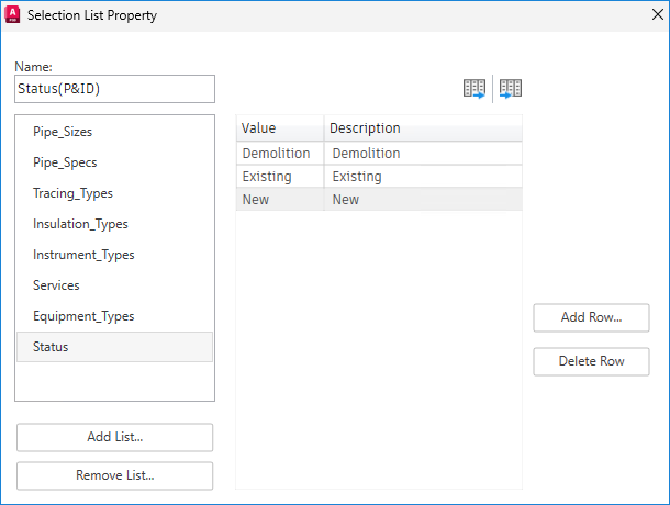 Displays the Add Row dialog box, where you enter a value and description for the new entry in the selection list.