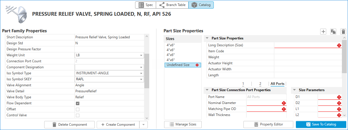- In the Catalog tab, Part Size Properties pane, under Sizes, click a size (for example, Undefined).
