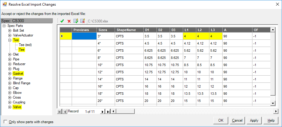 When you import spec or catalog parts, you can specify which changes to accept and which to reject. Importing data into the Spec Editor is like importing data into the AutoCAD Plant 3D toolset Data Manager.