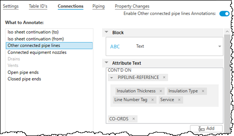 Specifies the connection text. You can add text, add properties from classes or PCF, or add symbols. You can also specify whether coordinates and elevation information is added to the annotation.