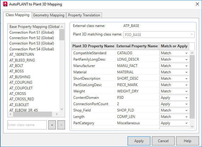 Maps global and individual class properties from AutoPLANT to their equivalents in Plant 3D.