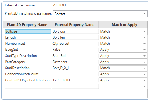- Specifies whether you want to match the properties or apply a specific property value. For example, for the AutoPLANT AT_BOLT class, the Plant 3D length property matches AutoPLANT Bolt_len. But the Plant 3D PartCategory property is set to the specific value Fasteners.
