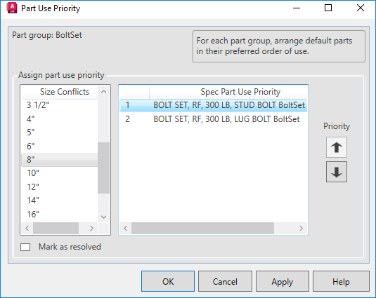 Specifies part sizes. You specify a part size before you can set Priority or Mark as Resolved. You can select more than one size conflict to mark as resolved.