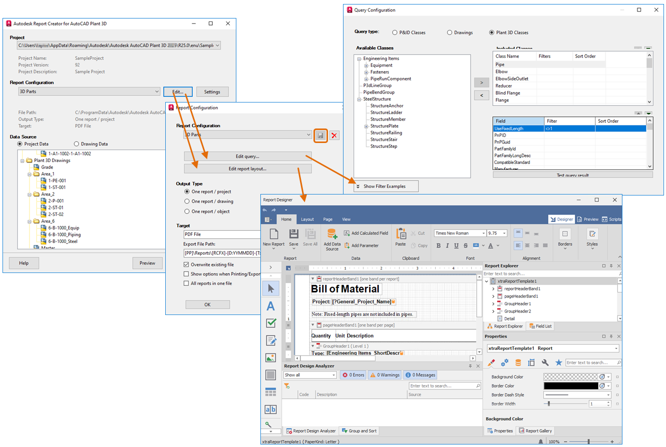 Report Creator is a tool for generating parts lists, BOMs, or specification sheets, using data from P&ID or Plant 3D drawings. You can use the tool simply to run pre-configured reports, a very simple two-step process.