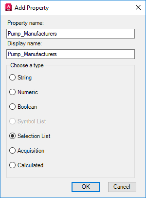• Under Property Name, enter a name for the new property (for example: Pump_Manufacturers). The name cannot contain any spaces.
