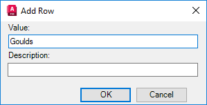 9. In the Add Row dialog box, enter the new value (for example: Goulds) and a description of the value, if necessary.