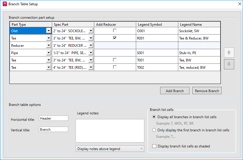 - Adds a part to use for the branch. If selected, a second row is added for the branch connection. For example, you can add a reducer to a tee or reducing tee.
