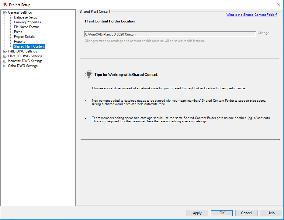 Share Email Facebook Twitter LinkedIn Shared Plant Content (General Settings Tree Node) Plant Content Folder Location Sets the location to store catalog changes and content on your computer. Parent topic: Project Setup Related Information Shared Content Folder