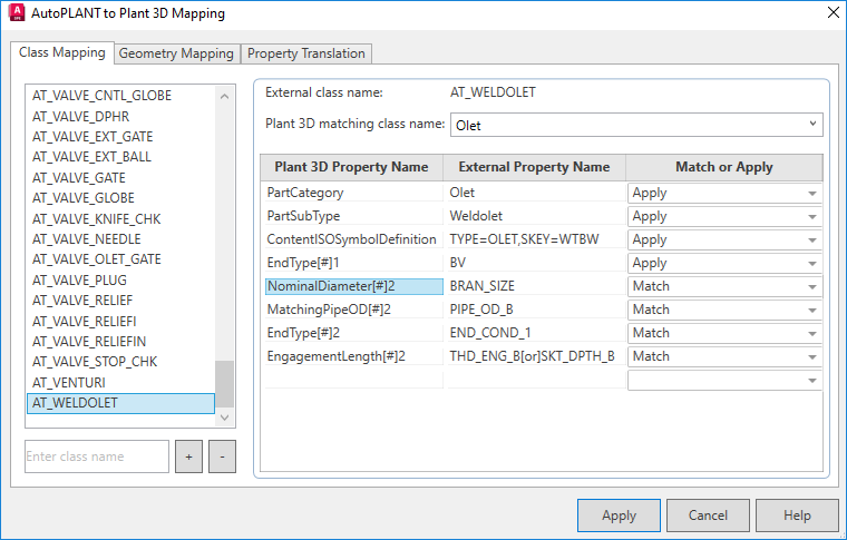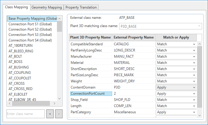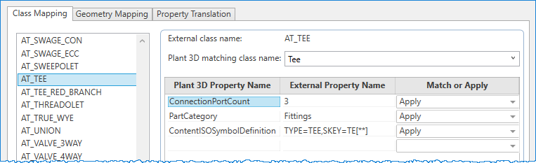 Global properties such as long description, pressure class, schedule, and so on, can be mapped once for all classes. Individual class properties, on the other hand, are mapped one-to-one to corresponding Plant 3D class properties.