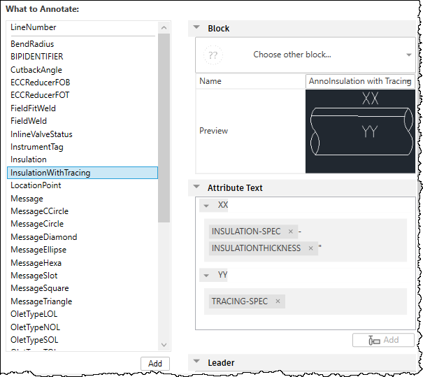 Lists existing piping annotations defined in IsoConfig.xml. You can also add new piping annotations.