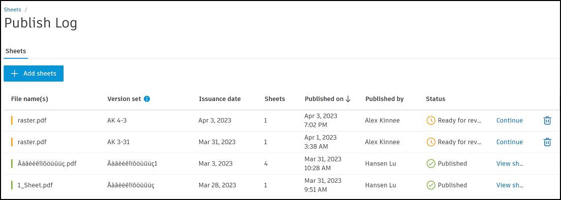 | Ready for review | The sheets are uploaded but a member needs to complete the publishing process. | Continue to resume the publishing workflow. Click the trash can to cancel publishing. |