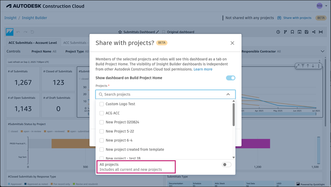 In Insight Builder, as an account administrator or executive, you can make dashboards accessible to selected projects and roles as a tab on Build Project Home.