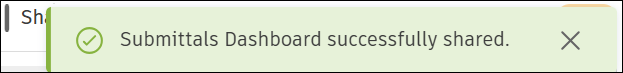 A green confirmation message appears in the top right corner, indicating the dashboard was successfully shared.