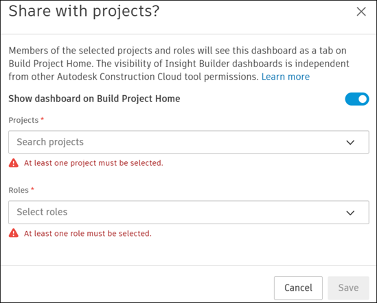 Use the Projects and Roles drop-down lists to select the projects and roles that should have access to the dashboard as a tab on Build Project Home.