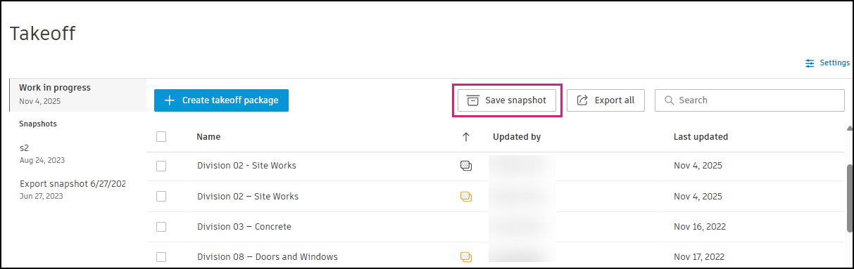 Note:Saving a snapshot can take a couple of minutes. We recommend waiting to save other takeoff work in the project during this time to ensure your snapshot data is saved correctly. You can't make changes to a snapshot, including adding or removing takeoff.
