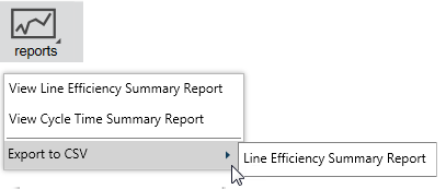 - Line Efficiency Summary Report to CSV provides a big picture of the simulation including elapsed time, total uptime and downtime, processor utilization comparisons, and details for specific objects. See the CSV Summary Report Reference table below for a description of the export fields.