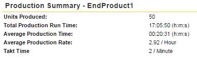 The Production Summary report displays the Units Produced, the Total Production Run Time, the Average Production Time, the Average Production Rate, and the Takt Time of your model.