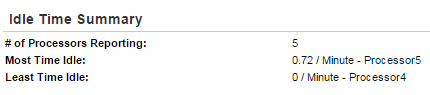 The Idle Time Summary displays the number of processors contributing information to the simulation data, the area where the most idle time occurred, and the area where the least idle time occurred.