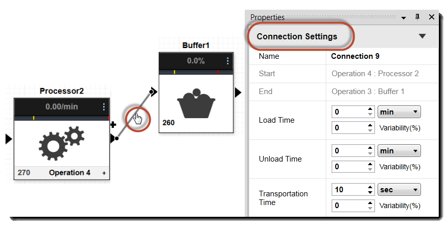 Connections form the links between objects, facilitating the transportation of materials and parts between sources, processors, and buffers, in the order required to produce an end product.