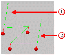 - Green lines indicate intermediate moves (where the probe is not expected to touch the part during the move) between probed positions. Lead-in and lead-out moves are also indicated in green. An additional green asterisk marker appears on lead in moves to distinguish them from lead out moves.