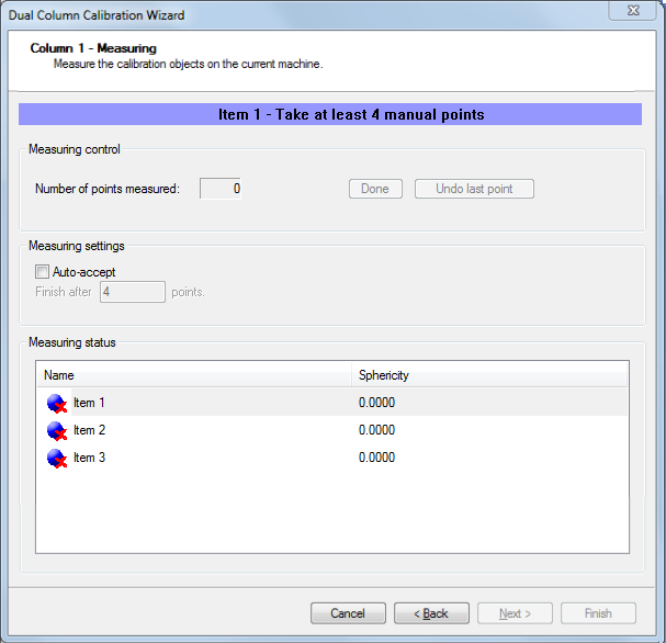- For each entry in the list of calibration items, probe at least four points on the sphere and click