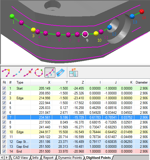 The digitised points table lists the locations and probing direction for all the points in the selected Digitised Curve item. Deselect the check box of a point to exclude it from the curve calculations; right-click a column heading and use the context menu to control the information displayed in the table. In addition, you can use the toolbar to manipulate the curve. Click: