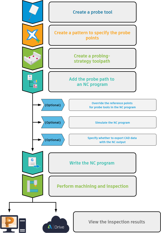 Share Email Facebook Twitter LinkedIn Workflow: Probing in PowerMill Follow these steps to create an inspection probe path and view the machine-generated results. Related Concepts Working with patternsTo add the active toolpath to selected entitiesSimulation Related Tasks To create a probe toolTo create a surface inspection probe-pathTo specify the probe-path output relative to the probe tip or probe centreTo export CAD data with the NC outputPostprocessing toolpathsWorking with the results of an inspection