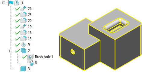 - Add a hole feature to the solid. The hole is added to the tree in the sub-branch above the general solid feature.
