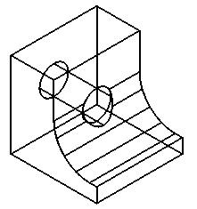 The model below shows two blocks with a hole in the middle of one block face. If you add fillet of 25 as shown, the hole is extended to maintain the curvature of the fillet, as shown in the wireframe view.