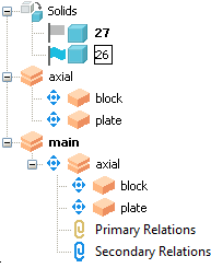 Each assembly contains all its components and the relationships between the components. In this example, there are two assemblies; axial and main, and two solids; 26 and 27, that are not part of either assembly: